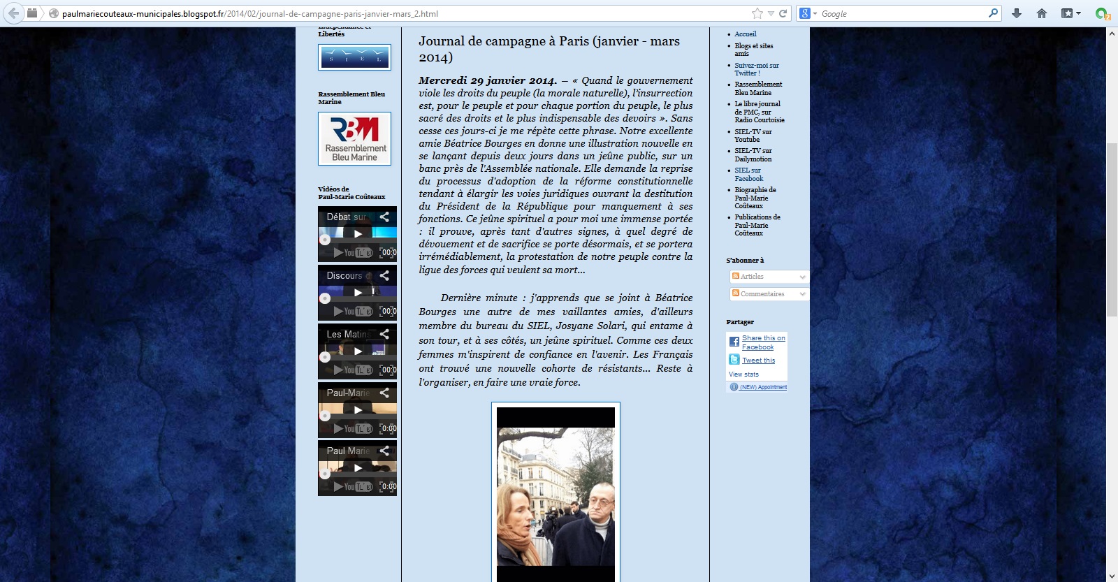Gonzague Malherbe a aussi apporté son soutien à Béatrice Bourges, dissidente radicale de la Manif pour Tous et présidente du Printemps français, lui attribuant d’ailleurs la mauvaise cause1. Béatrice Bourges a notamment été soutenue dans sa démarche par Jean-Marie Le Pen, Marion Maréchal Le Pen, Paul-Marie Coûteaux (président du SIEL, cadre du Rassemblement Bleu Marine), Josyane Solari (membre du bureau politique du SIEL) et Gérard Brazon, candidat à la mairie de Puteaux. De ce sujet, Marine Le Pen a déclaré qu’il s’agissait de «la 2665e préoccupation des Français dans l’ordre chronologique» (le mot chronologique est surprenant : il signifie qu’il s’agit de la «2665e préoccupation des Français» depuis l’existence de la France (ou depuis que la France existe, ou n’importe quelle formulation moins épique)), argument habituel chez Marine Le Pen face à une question dérangeante, et qui nie l’importance des liens en politique.