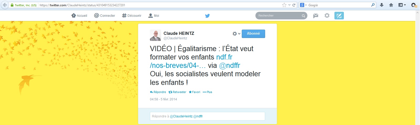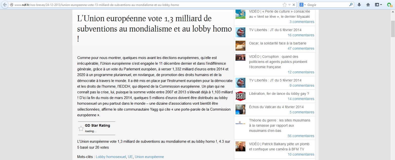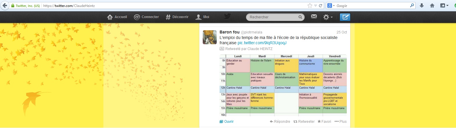 Il s’inquiète par ailleurs que l’Europe « vote 1,3 milliards d’euros au mondialisme et au lobby homo » (Nouvelles de France, site de droite catholique conservatrice , explique tout de même qu’il s’agit d’une « promotion des droits humains et de la démocratie à travers le monde »), que l’État « Maçônnique » veuille « formater » les enfants (la discussion, la réflexion sur les principes qui fondent notre société sont des méthodes bien connues de formatage), et diffuse un emploi du temps avec des « cours de prière musulmane », d’« initiation à l’homosexualité» , d’« éducation sexuelle avec travaux pratiques », d’« initiation aux drogues », d’« histoire de l’Islam » et du « communisme », de « déchristianisation » – ainsi que des « dessins animés décadents (Bob l’éponge…) » – qui serait celui de la « république socialiste française ».