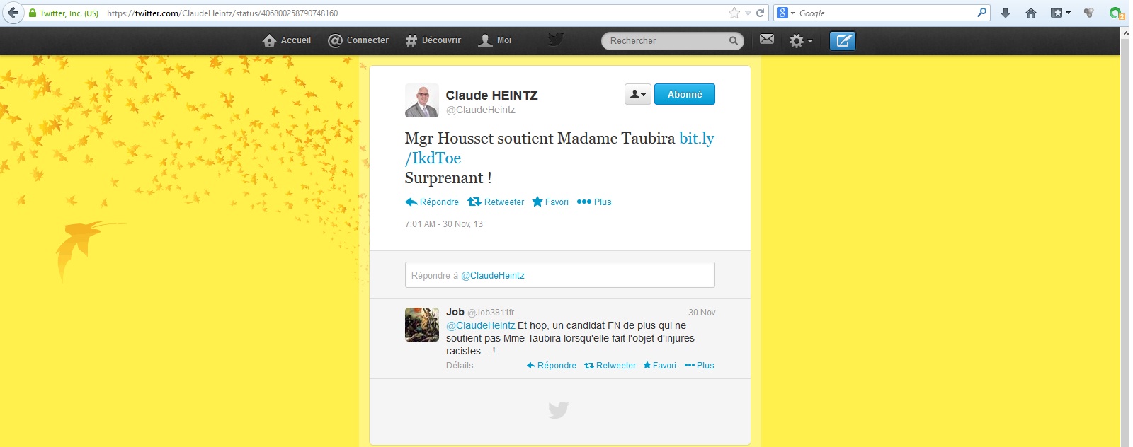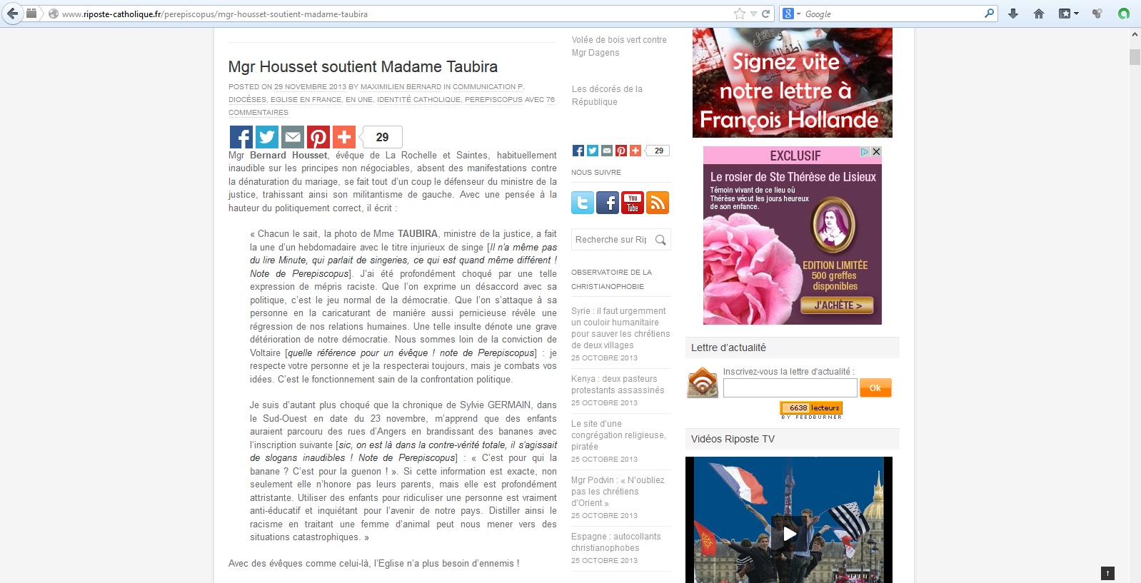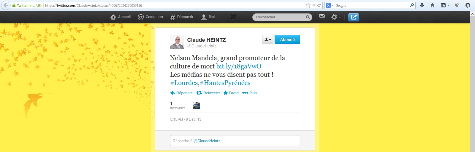 Peu après la mort de Nelson Mandela, il a relayé un article qui présente celui-ci comme un « promoteur zélé de la culture de mort » au « bilan de dimensions génocidaires »… pour avoir légalisé l’avortement en Afrique du Sud. Il faut dire que Jean-Marie Le Pen a qualifié Mandela de « terroriste », et que Bruno Gollnisch s’est dit opposé à « l’unanimisme des dithyrambes » sur Mandela. Le candidat à la mairie de Lourdes a aussi relayé un article du même site qualifiant de « surprenant » le soutien de Monseigneur Housset à Taubira lors de l’affaire de la banane, « trahissant ainsi son militantisme de gauche » et son « politiquement correct ».