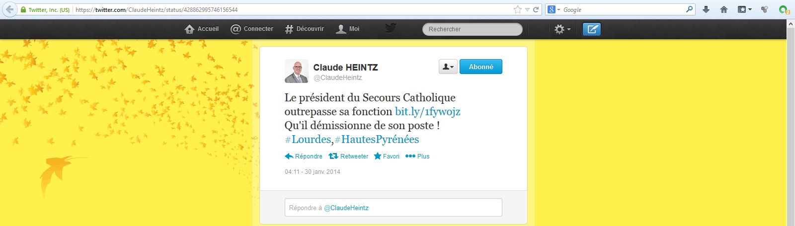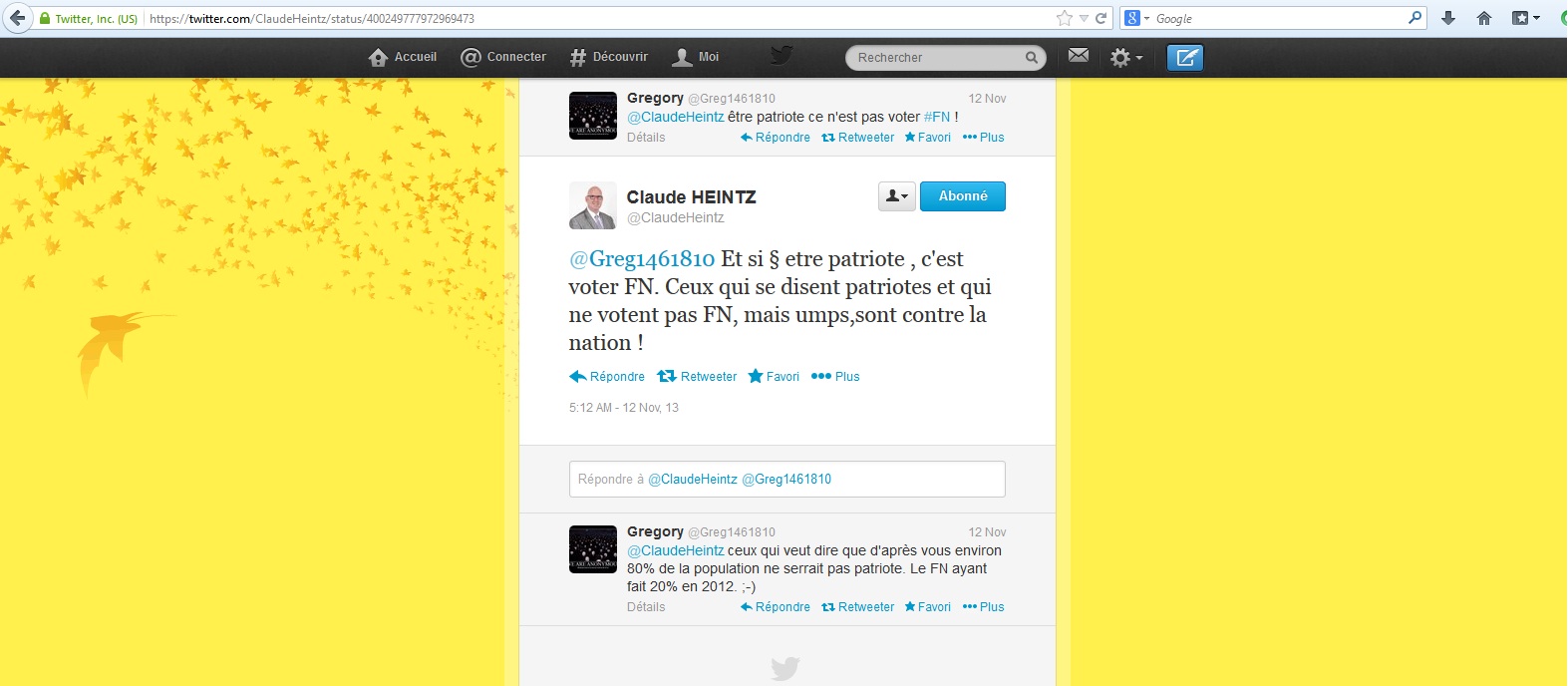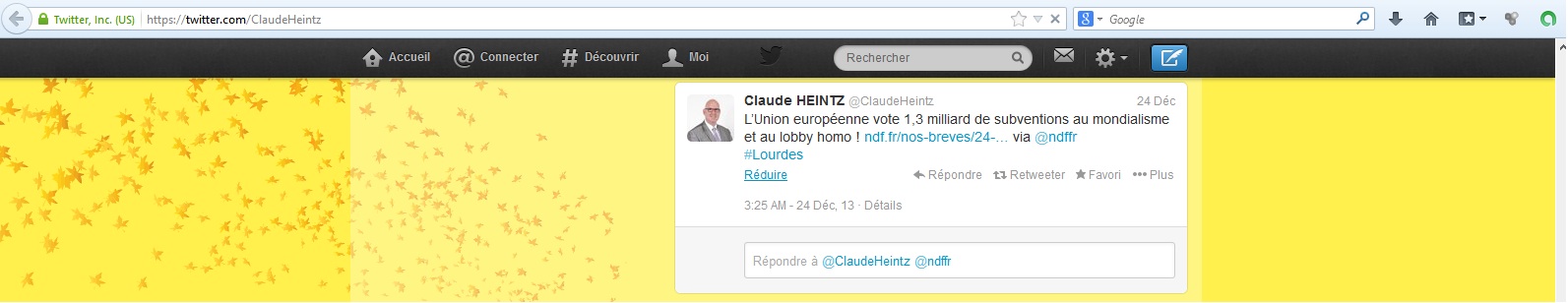 Les vues de Claude Heintz sur le pluralisme politique sont en effet très arrêtées. Il explique ainsi qu’« être patriote, c’est voter FN », et que « ceux qui votent UMPS sont contre la nation ». Il reprend aussi un article (toujours le même site) qui explique que le « président du Secours catholique outrepasse ses fonctions », non pas parce qu’il soutient un homme politique, mais parce qu’il soutient un homme politique de gauche.