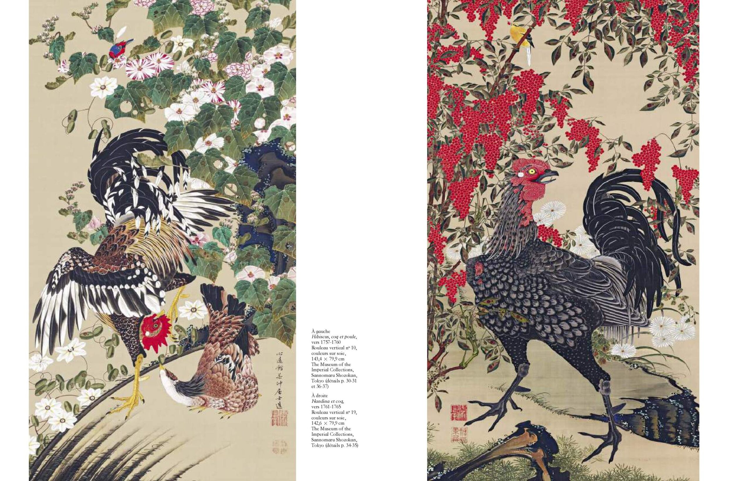 Devant ces trois rouleaux, nous sommes très loin du hiératisme absolu du portrait de Shigemori peint par Fujiwara Takanobu (1143-1206) et que Malraux considérait comme la Joconde de l’Extrême-Orient. Il avait saisi l’insaisissable du rouleau par ces seuls mots : « autour du Shigemori, il ne se passe rien » (L’Intemporel, OC V, Pléiade, p.872). Au contraire, à travers ces rouleaux de Jakuchū conservés au temple Shōkoku-ji, nous comprenons qu’il se passe quelque chose. Pour le comprendre, il suffit de considérer ces rouleaux comme appartenant aux peintures du Royaume coloré des êtres vivants, composé du triptyque et de vingt-quatre peintures d’animaux et de plantes, même si, aujourd’hui, l’ensemble est dispersé. Joséphine Bindé relie superbement la signification des trois Bodhisattvas avec la flore et la faune exubérante transposée par l’artiste dans leur éternité. Ces peintures n’étaient évidemment pas présentées en permanence au public, ni aux moines du temple, mais « au sixième mois de chaque année lors des cérémonies de confession collective », lisons-nous. Cette précision nous donne à voir immédiatement la dimension spirituelle de ces poissons qui nagent dans une eau et un temps qui ne subissent plus le règne de l’impermanence et de la mort. Mais l’éternité a aussi ses aléas pour les êtres vivants et Joséphine Bindé de nous rappeler que l’ensemble des peintures, hormis le triptyque de bodhisattvas, a été offert en 1889 par les bonzes à la maison impériale et se trouve conservé aujourd’hui par le Musée Sannomaru Shozakan de Kyoto, destiné aux collections impériales.