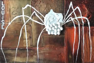 [Si les avions le lui permettent Arrabal aimerait amener son huile sur toile de 195 cm x 130 cm La araña blanca de Louise pour rendre hommage à Menú … Cuenca -et surtout sa ville enchantée, vraiment préhistorique, qui ne figure pas dans les circuits touristiques habituels- est digne du Dr. Faustrol]